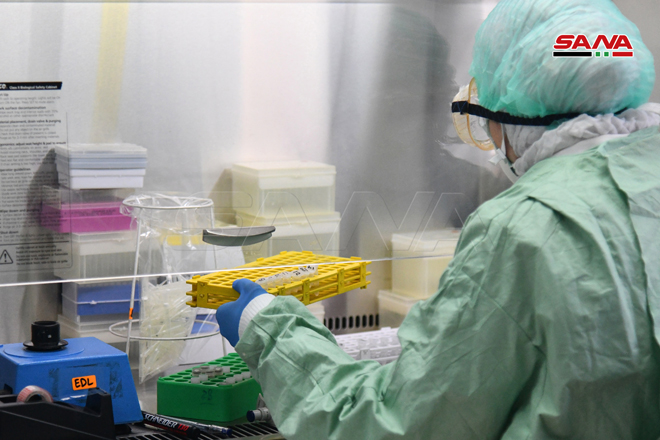 Damas-SANA / Le personnel médical dans le laboratoire des maladies d’urgence et des épidémies à Damas relevant du ministère de la Santé travaille 24/24 pour mener des tests de dépistage de cas de coronavirus selon des normes internationales.