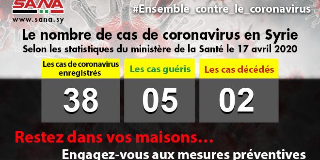 Damas-SANA / Le ministère de la Santé a indiqué que cinq nouveaux cas de coronavirus avaient été enregistrés pour que le bilan de cas infectés en Syrie s’élève à 38.