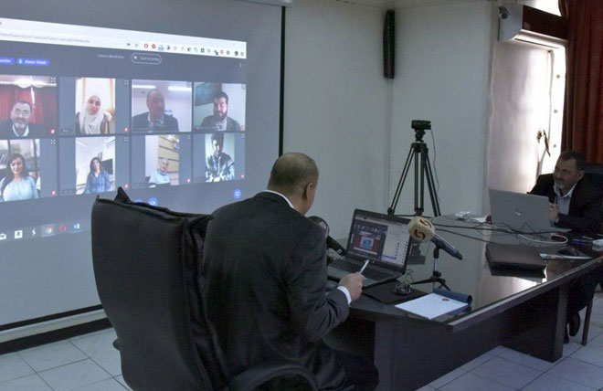 Damas-SANA / Le ministère de l’Information a lancé aujourd’hui son 1er atelier de travail virtuel sur la couverture médiatique de la pandémie de coronavirus via la technologie de la communication en ligne, dans le cadre des mesures préventives contre le coronavirus.