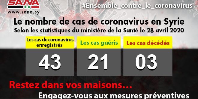Dans un communiqué, le ministère de la Santé a fait noter que le nombre de cas de coronavirus enregistrés en Syrie jusqu’à présent est 43, dont 21 ont été guéris et 3 sont décédés.
