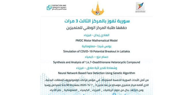 Damas-SANA / Les étudiants du centre national des excellents étudiants, qui ont pris part en ligne à la conférence Kolmogorov russe sur la recherche scientifique, ont remporté la 3e place et obtenu un certificat d’appréciation pour les recherches avec lesquelles ils ont participé à la conférence dans les spécialisations de la physique, de la chimie, de l’informatique et de la modélisation mathématique.