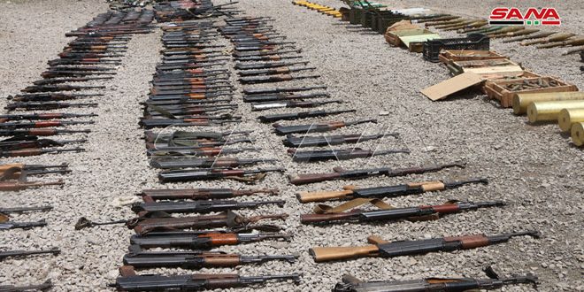 Découverte de grandes quantités d’armes et de munitions abandonnées par les terroristes dans la banlieue de Daraa