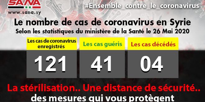 Dans un communiqué, dont une copie est parvenue à SANA, le ministère a fait noter que le nombre de cas enregistrés en Syrie jusqu’aujourd’hui arrive à 121 cas, dont 41 ont été guéris et 4 autres morts.