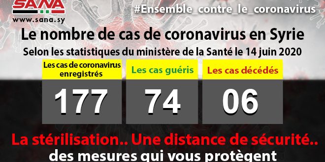 Dans un communiqué, le ministère a indiqué que le bilan des cas de coronavirus enregistrés jusqu’aujourd’hui en Syrie avait atteint 177 cas, dont 74 cas de guérison et 6 décès.