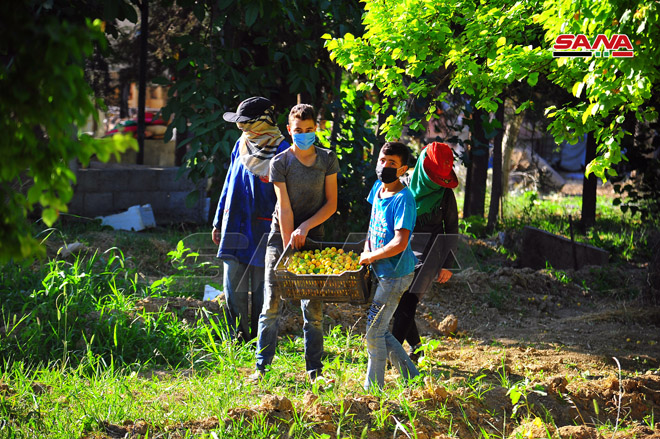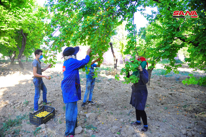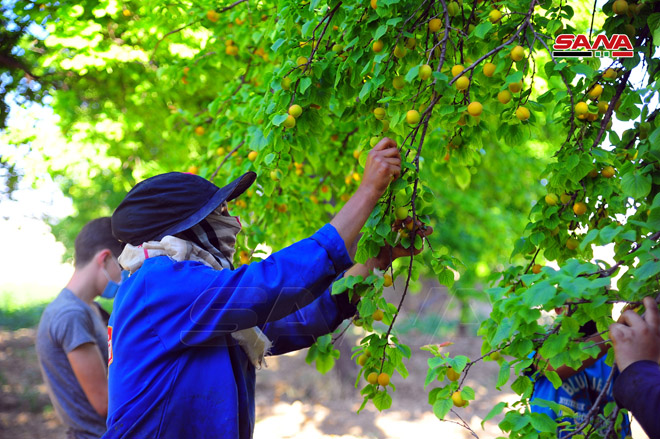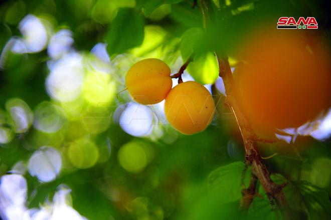 Banlieue de Damas-SANA/Les habitants de la Ghouta orientale dans la banlieue de Damas récoltent les abricots dans leurs fermes et vergers fructueux, qui produisent la plupart des fruits et légumes.