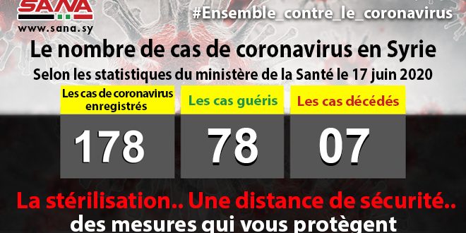 Dans un communiqué, le ministère a fait savoir que le bilan des cas de coronavirus enregistrés en Syrie avait atteint jusqu’à présent 178, dont 78 cas de guérison et 7 décès.