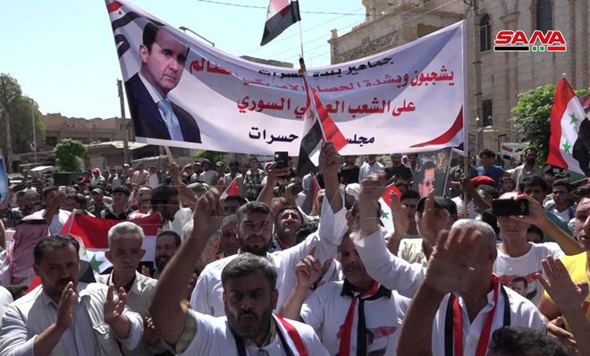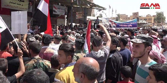 Deir Ezzor-Sana / Un sit-in national a été observé aujourd’hui dans la ville Boukamal dans la banlieue de Deir Ezzor pour dénoncer les mesures coercitives et unilatérales imposées au peuple syrien et pour condamner la soi-disant « Loi César ».