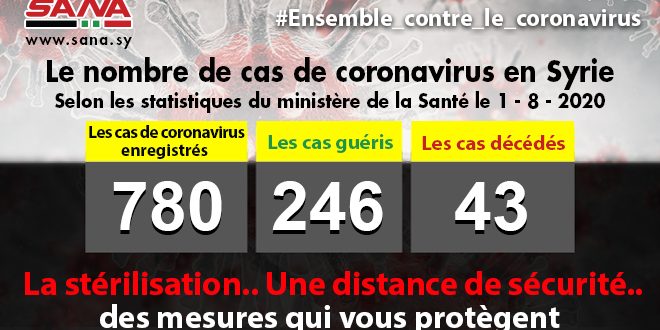 Dans un communiqué publié aujourd’hui, le ministère a indiqué que le bilan des cas de coronavirus enregistrés jusqu’à présent en Syrie avait atteint 780, dont 246 cas de guérison et 43 décès.