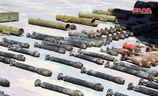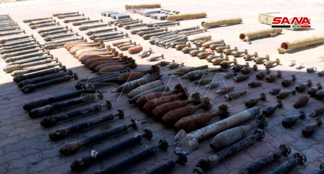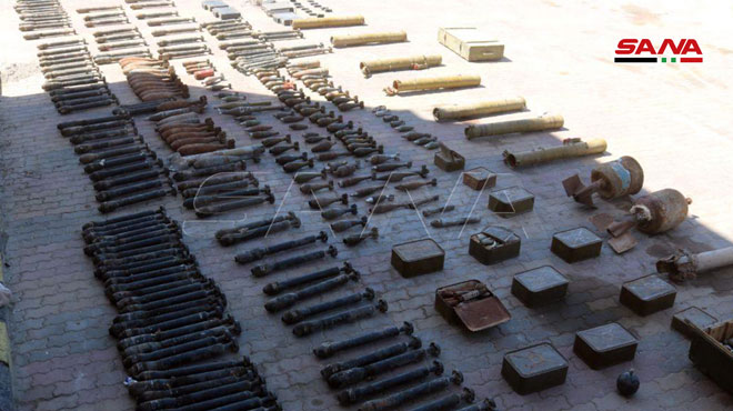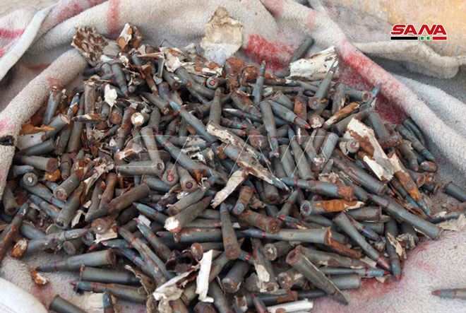Découverte de munitions variées et d’appareils de télécoms abandonnés par les terroristes de «Daech» dans la zone de Mayadine dans la banlieue de Deir Ezzor
