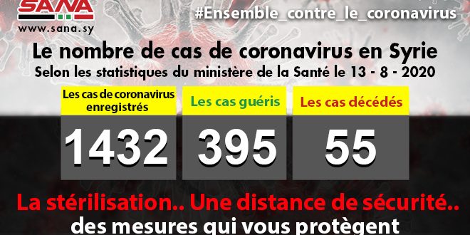 Dans un communiqué publié aujourd’hui, le ministère a fait savoir que le bilan des cas de coronavirus enregistrés jusqu’à présent en Syrie avait atteint 1432, dont 395 cas de guérison et 55 décès.