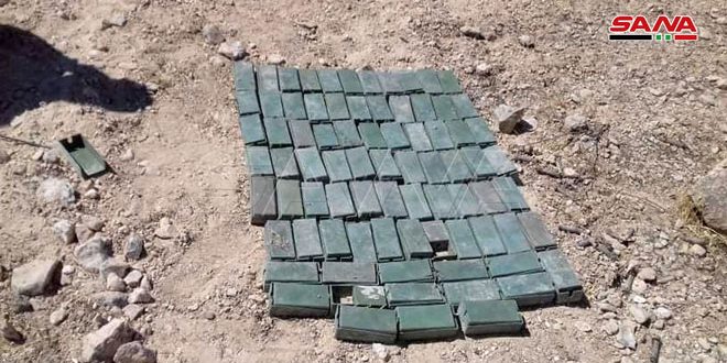 Hama – SANA/ Lors de ratissage des terres agricoles libérées du terrorisme par l’armée arabe syrienne dans la zone de Salamiyah, des unités de l’armée ont saisi de grandes quantités d’armes et de munitions abandonnées par les terroristes dans la banlieue de Hama.