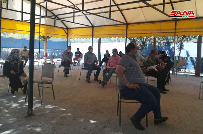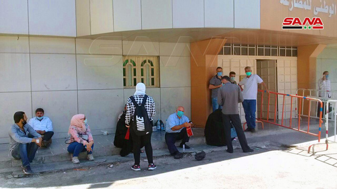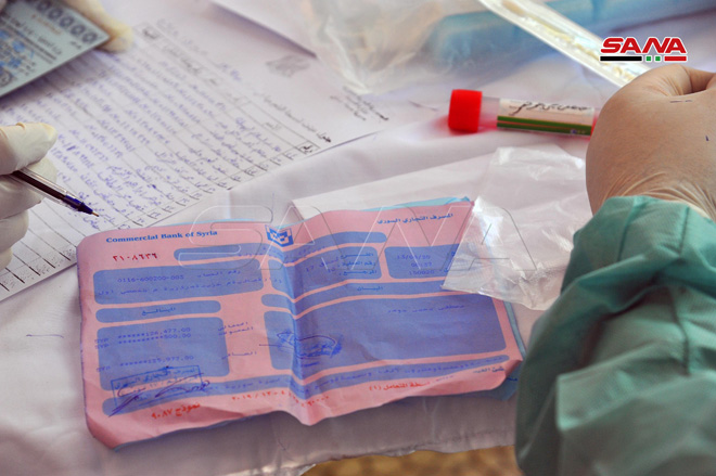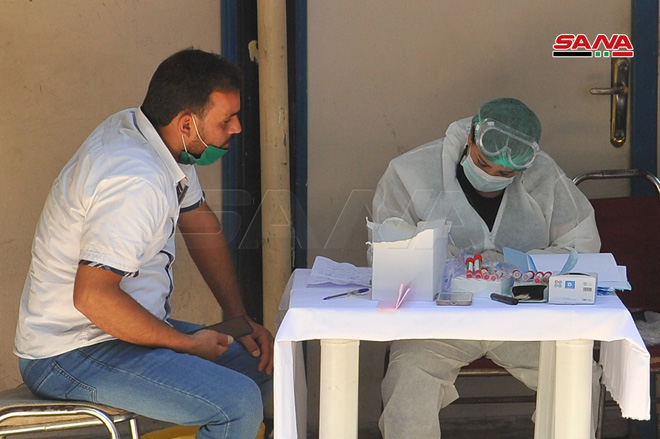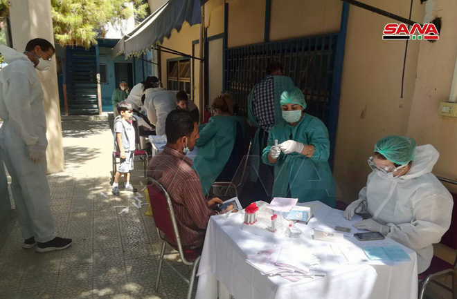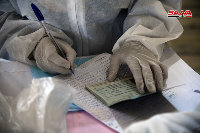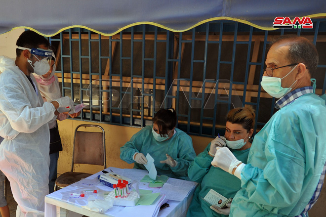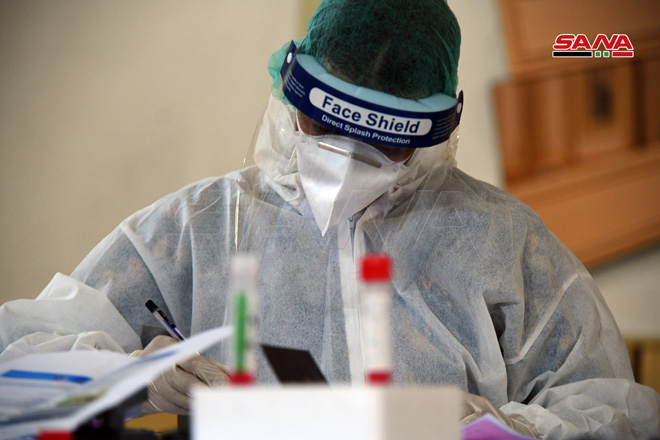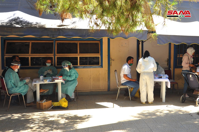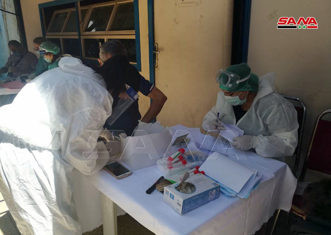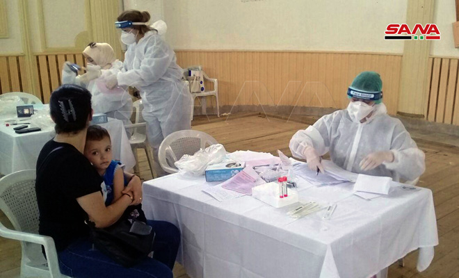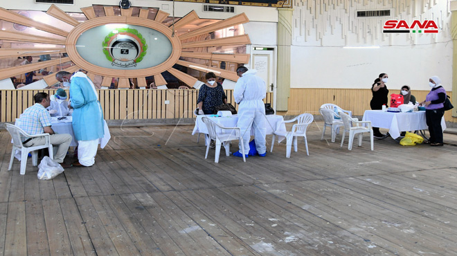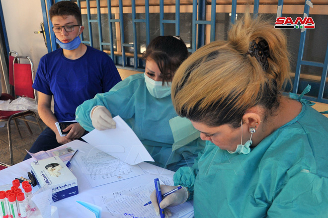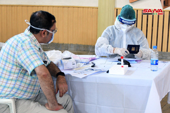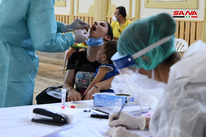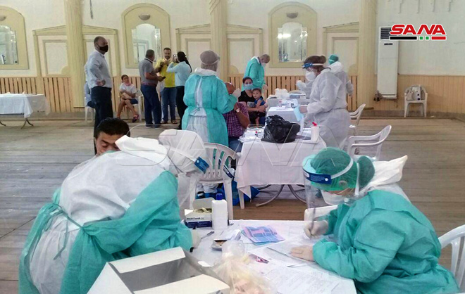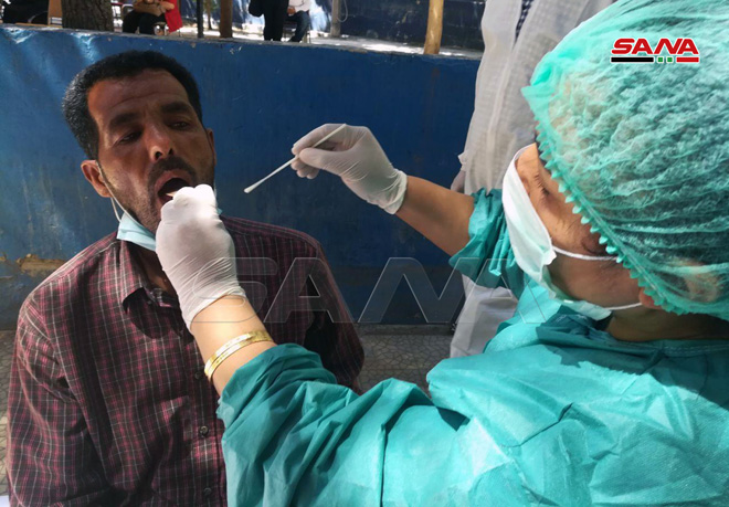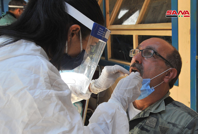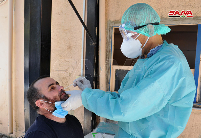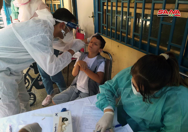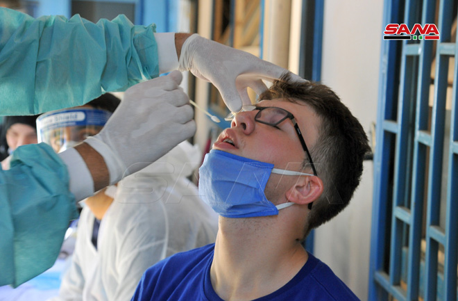 Prise dans les deux salles d’al-Jalaa et de Tichrine à Damas des écouvillons pour le test de coronavirus « PCR »
