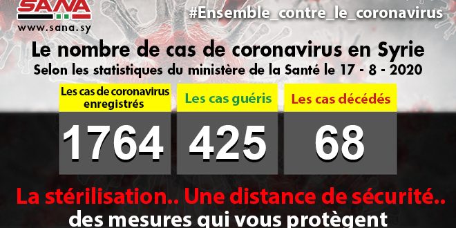 Dans un communiqué publié aujourd’hui, le ministère a fait savoir que le bilan des cas de coronavirus enregistrés jusqu’à présent en Syrie avait atteint 1764, dont 425 cas de guérison et 68 décès.