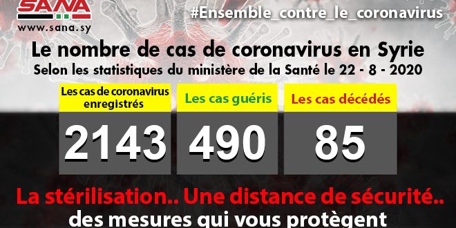 Dans un communiqué publié aujourd’hui, le ministère a fait savoir que le bilan des cas de coronavirus enregistrés jusqu’à présent en Syrie avait atteint 2143, dont 490 cas de guérison et 85 décès.