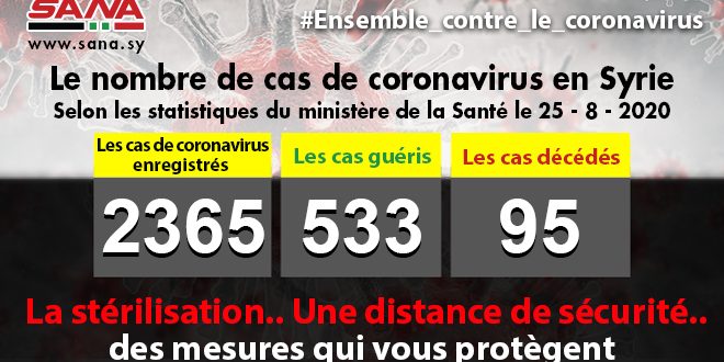 Dans un communiqué publié aujourd’hui, le ministère a fait savoir que le bilan des cas de coronavirus enregistrés jusqu’à présent en Syrie avait atteint 2365, dont 533 cas de guérison et 95 décès.