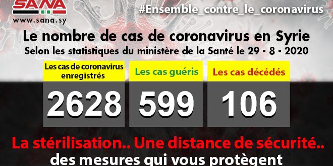Dans un communiqué dont une copie est parvenue à SANA, le ministère a fait savoir que le bilan des cas de coronavirus enregistrés jusqu’à présent en Syrie avait atteint 2628, dont 599 cas de guérison et 106 décès.