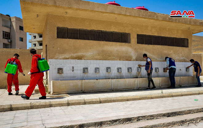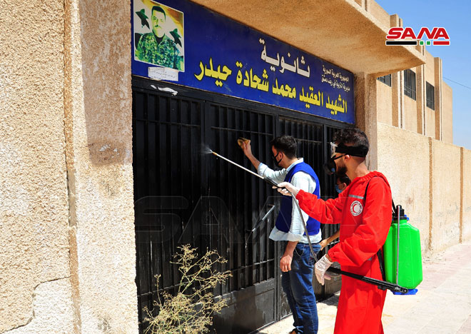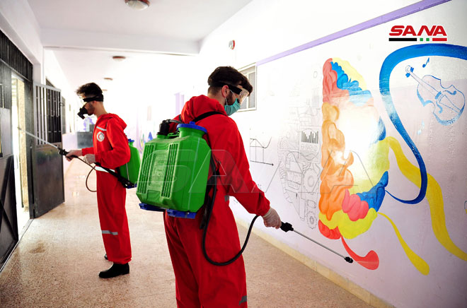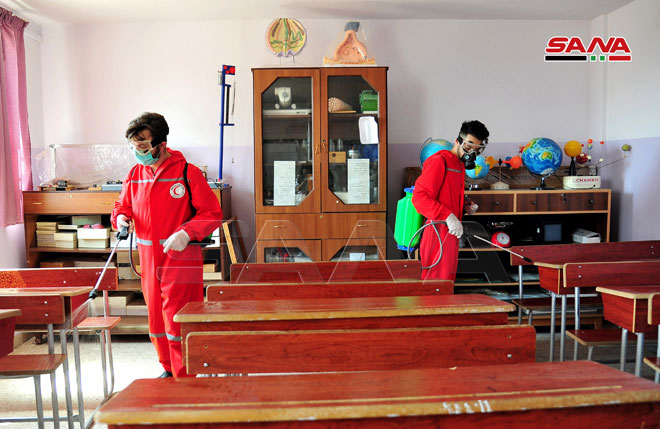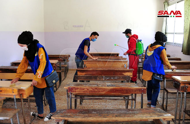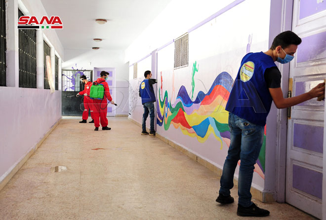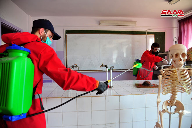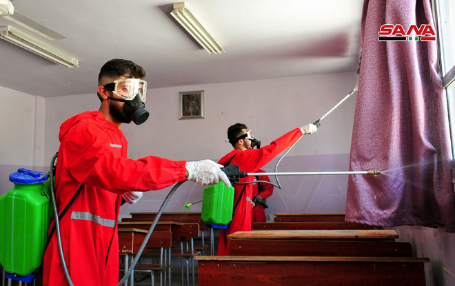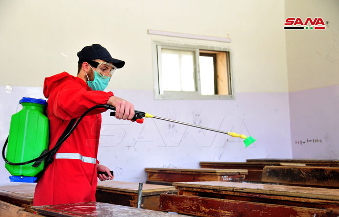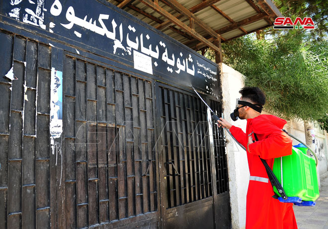 Une campagne de désinfection dans les écoles de Keswa dans la banlieue de Damas