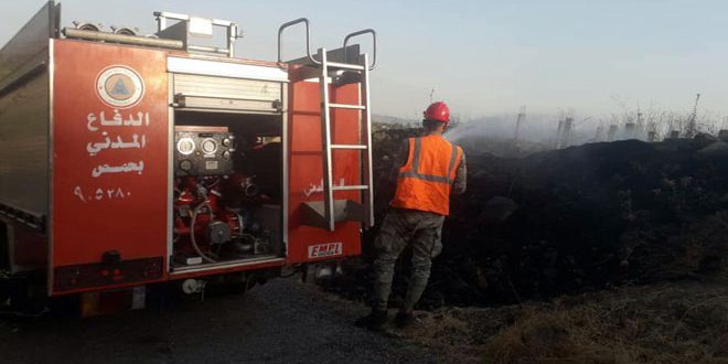 Homs-SANA / Les pompiers de Homs et des éléments de la défense civile ont éteint un grand incendie dans le village de Halat dans la région de Tal Kalakh, et un autre dans le village d’Anaz dans la banlieue ouest de Homs.