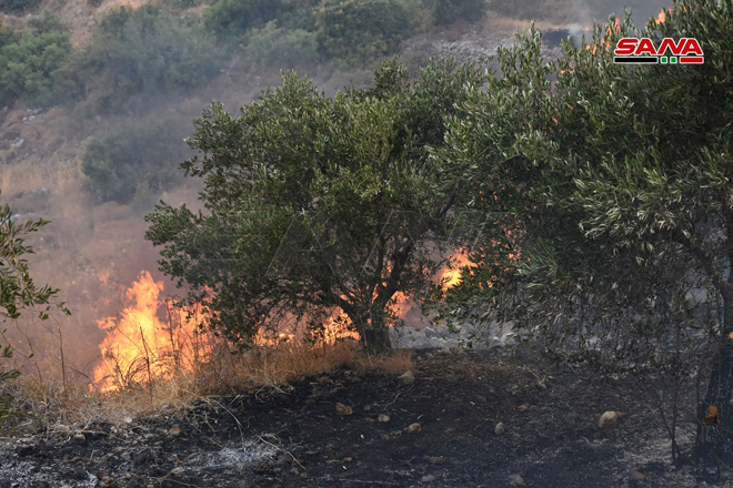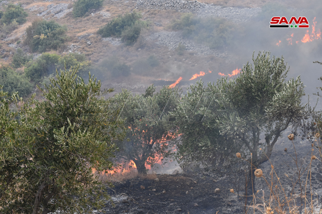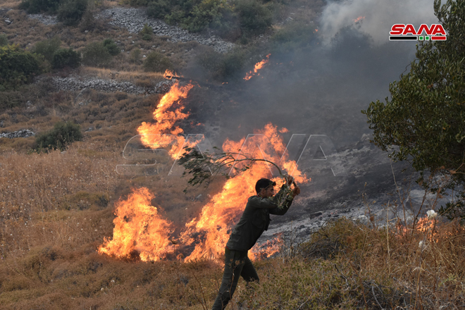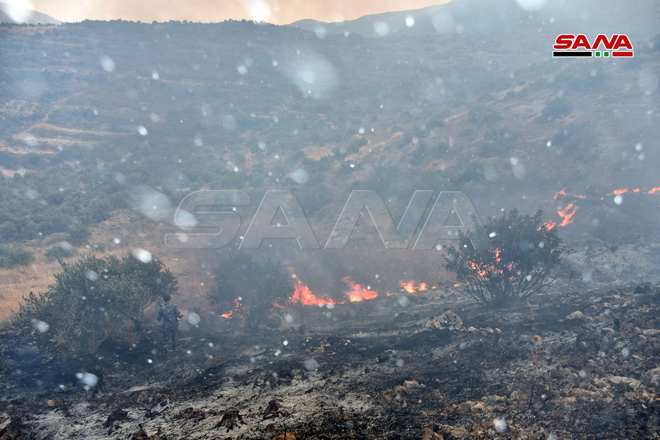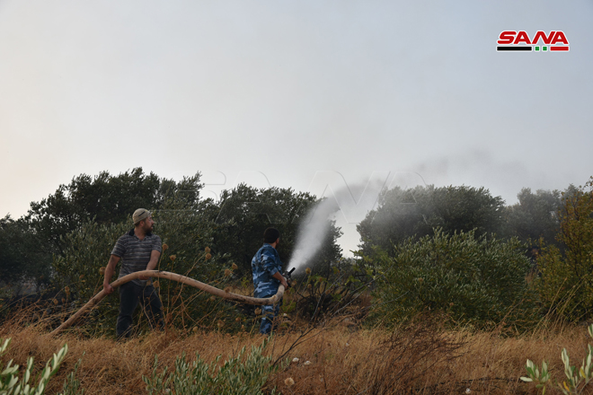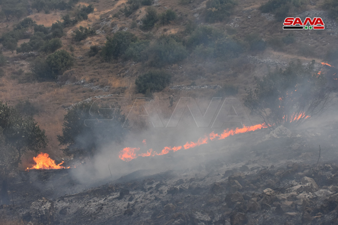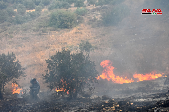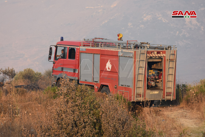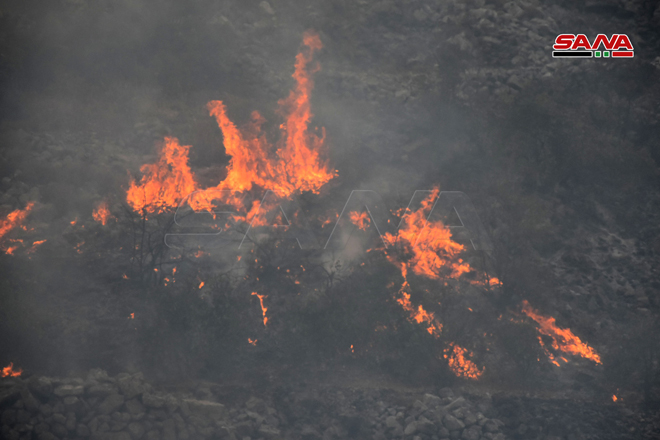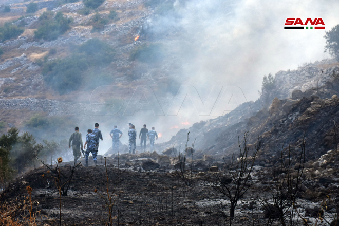 Des sapeurs-pompiers œuvrent pour éteindre le feu dans la zone d’Ain Halaqim au sud-ouest de Mussyaf