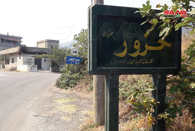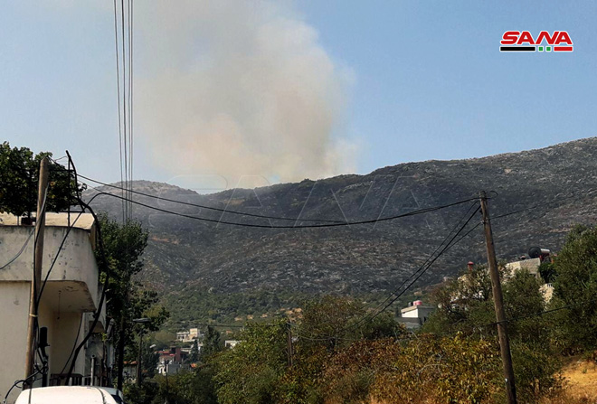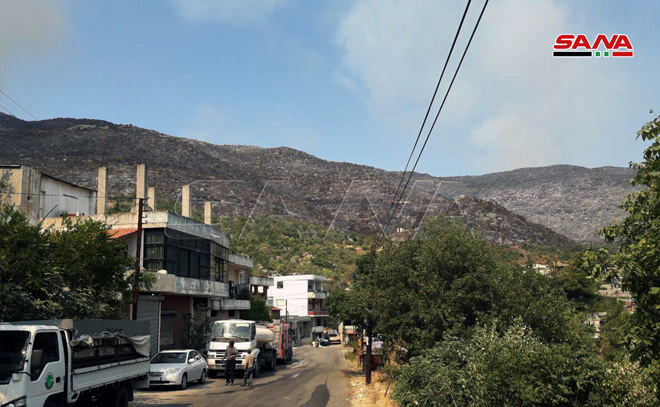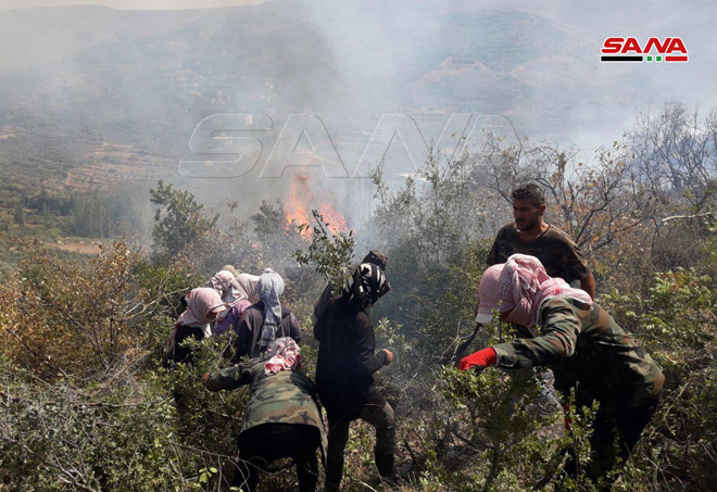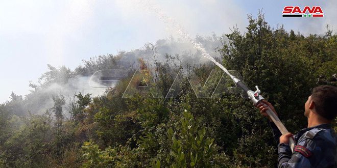 Les équipes des sapeurs-pompiers poursuivent l’extinction à la périphérie de la localité de Hazour au sud- ouest de Messyaf