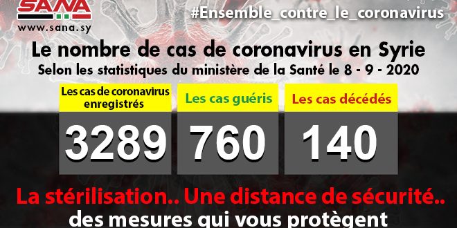 Dans un communiqué dont une copie est parvenue à SANA, le ministère a fait savoir que le bilan des cas de coronavirus enregistrés jusqu’à présent en Syrie avait atteint 3289, dont 760 cas de guérison et 140 décès.