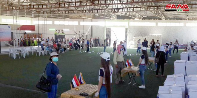 Hama -SANA /Le Conseil des affaires syro-russe a distribué aujourd’hui 55 tonnes de denrées sur les familles touchées par la guerre et les familles des martyrs et des blessés dans la zone de Salamiyah dans la banlieue est de Hama.
