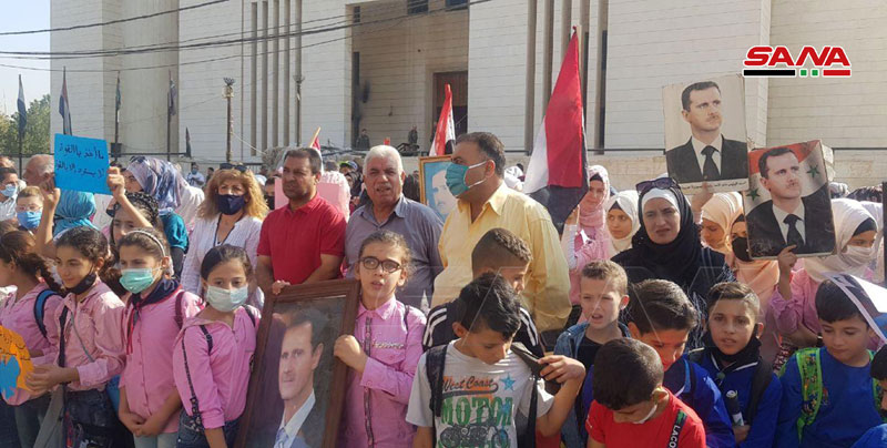 Hassaké-SANA/les corps enseignant, le personnel administratif et les élèves des écoles de Hassaké ont observé aujourd’hui un sit-in devant la Direction de l’Education dans la ville pour protester contre les pratiques de la milice des « FDS », soutenue par l’occupant américain, qui saisit les écoles et prive des milliers d’élèves et d’étudiants de l’enseignement.
