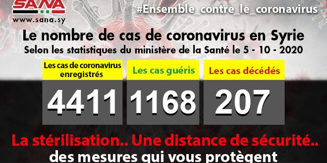 Dans un communiqué dont une copie est parvenue à SANA, le ministère a fait savoir que le bilan des cas de coronavirus enregistrés jusqu’à présent en Syrie avait atteint 4411, dont 1168 cas de guérison et 207 décès.