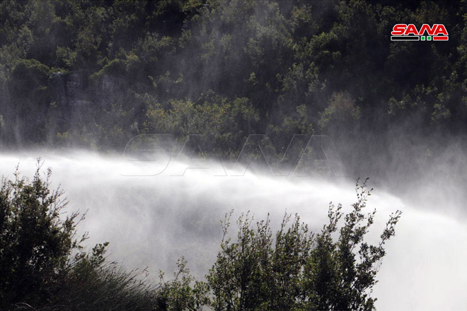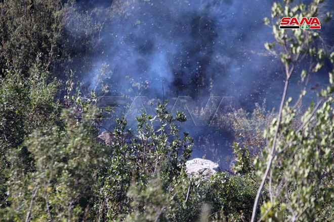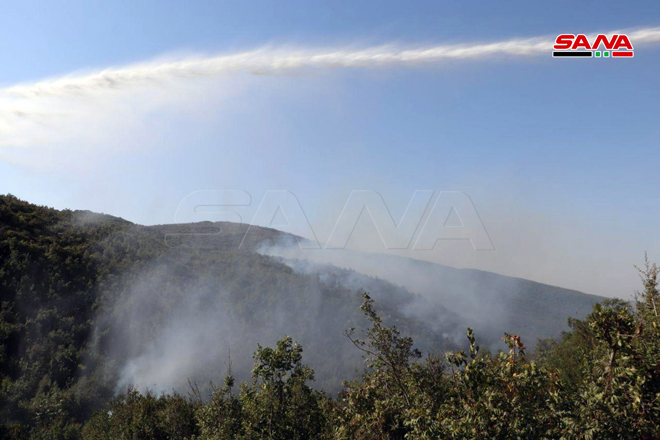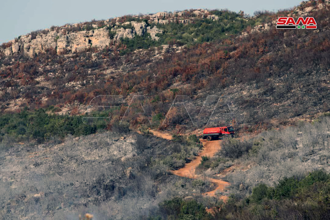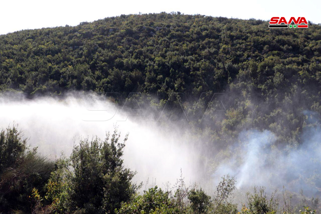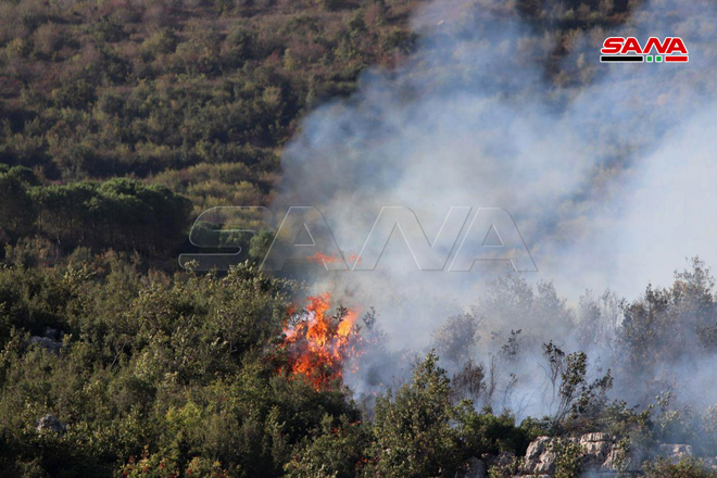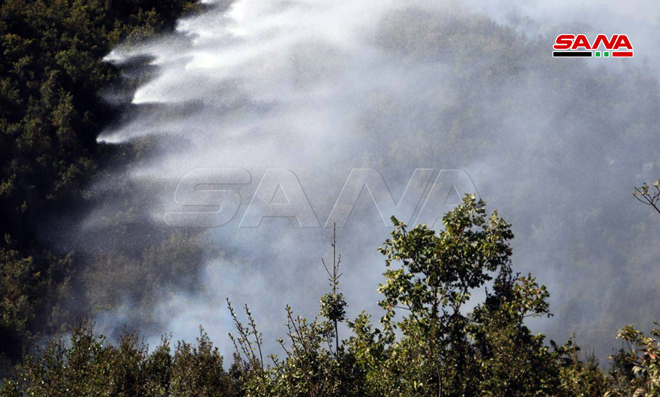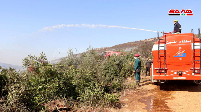 Les sapeurs-pompiers encerclent les feux dans le village de Qreb Ali et poursuivent l’extinction des incendies à Ayoun al-Wadi à Homs