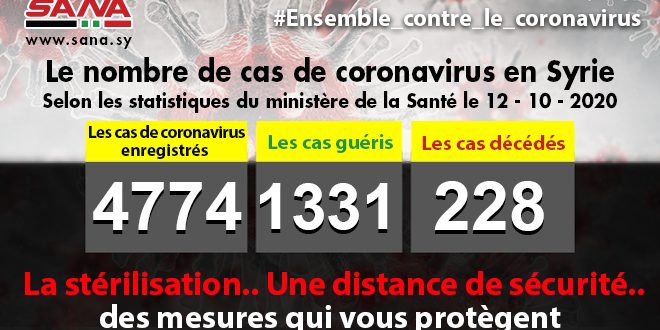Dans un communiqué dont une copie est parvenue à SANA, le ministère a fait savoir que le bilan des cas de coronavirus enregistrés jusqu’à présent en Syrie avait atteint 4774, dont 1331 cas de guérison et 228 décès.