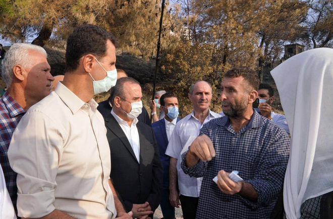 Dans la banlieue de Qerdaha, le président al-Assad a visité le village de Bessout, dont la population a été obligée de quitter les maisons du fait des incendies, et à s’y retourner après leur extinction en collaboration avec les équipes de la défense civile et l’armée arabe syrienne.