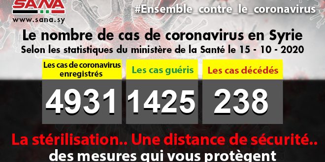 Dans un communiqué dont une copie est parvenue à SANA, le ministère a fait savoir que le bilan des cas de coronavirus enregistrés jusqu’à présent en Syrie avait atteint 4931, dont 1425 cas de guérison et 238 décès.