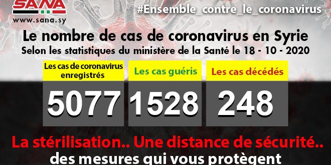Damas-SANA /18/10/ Le ministère de la Santé a souligné aujourd’hui que 44 nouveaux cas de coronavirus, 34 cas de guérison et 3 décès avaient été enregistrés en Syrie.