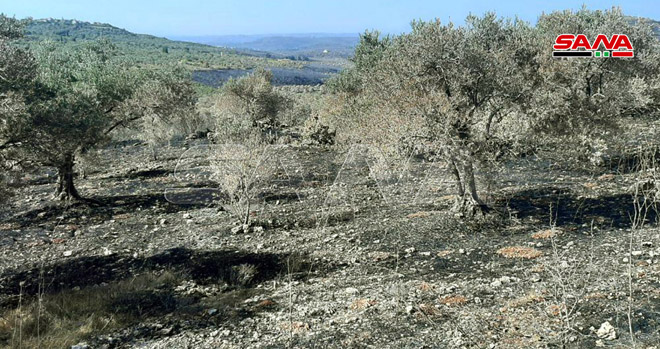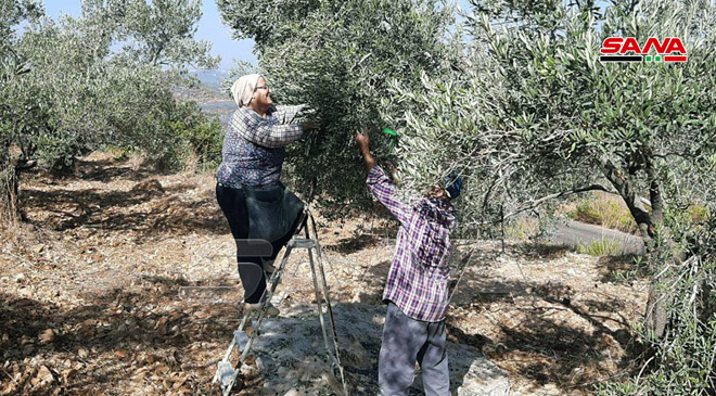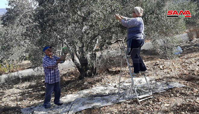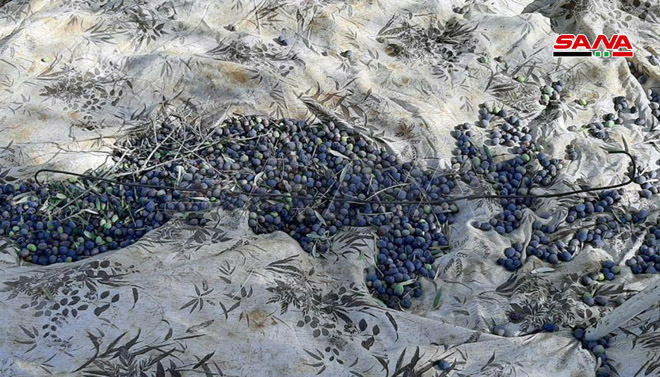 Les paysans du village Hanbara dans la banlieue ouest de Homs récoltent les olives dans leurs fermes, quelques jours après les incendies qui avaient touché des centaines d’oliviers