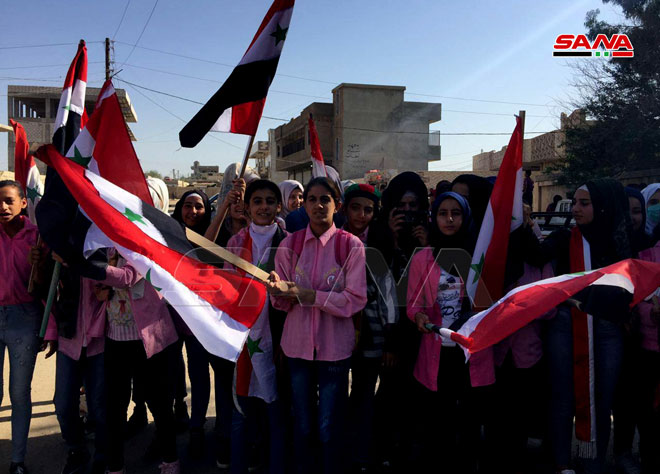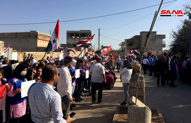 Hassaké-SANA/ La population de Qamichli a observé aujourd’hui un sit-in de protestation contre les deux occupants américain et turc et de rejet de la prise de contrôle par la milice « FDS » des écoles et des maisons, simultanément avec un autre sit-in organisé par les enseignants et les élèves de Hassaké pour rejeter la prise de contrôle par la milice des écoles et la privation des millier d’élèves de l’éducation.