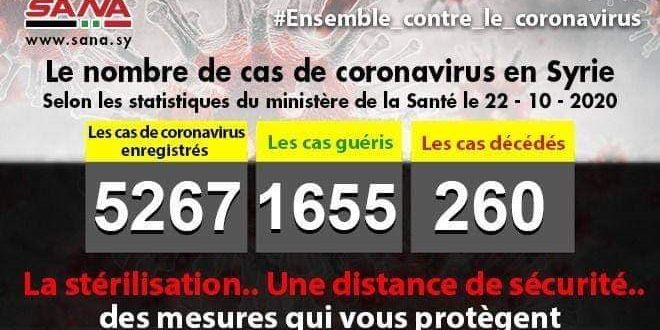Dans un communiqué, dont une copie est parvenue à SANA, le ministère a fait savoir que le bilan de cas de coronavirus enregistrés jusqu’à présent en Syrie avait atteint 5267, dont 1655 cas de guérison et 260 décès.