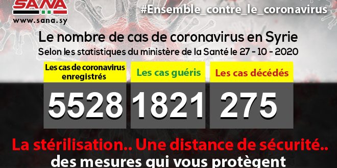 Dans un communiqué dont une copie est parvenue à SANA, le ministère a fait savoir que le bilan des cas de coronavirus enregistrés jusqu’à présent en Syrie avait atteint 5528, dont 1821 cas de guérison et 275 décès.