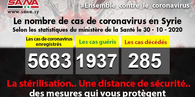 Dans un communiqué dont une copie est parvenue à SANA, le ministère a fait savoir que le bilan des cas de coronavirus enregistrés jusqu’à présent en Syrie avait atteint 5683, dont 1937 cas de guérison et 285 décès.