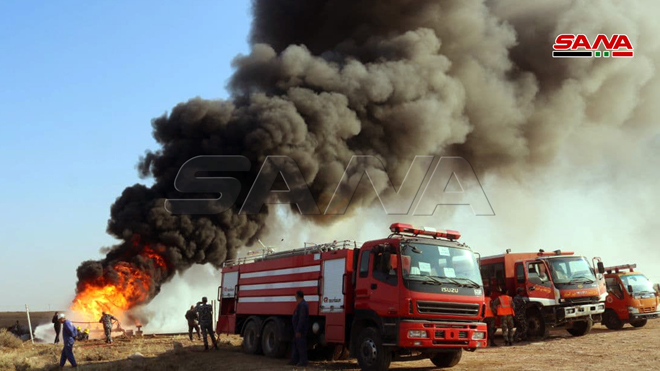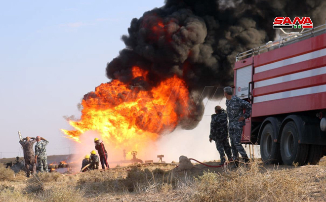 Extinction de l’incendie qui a éclaté dans l’une des lignes de pétrole du champ d’al-Kharata sur la route de Deir Ezzor / al-Mayadine