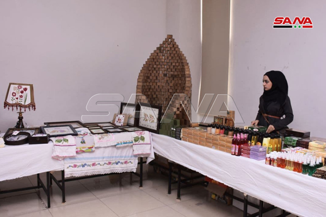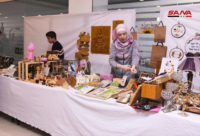 Alep-SANA / Le salon d’artisanat « Pouls d’Alep » a été ouvert à Alep avec la participation de plus de 63 artisans représentant les artisanats de poterie, de calligraphie, de cuivre et de tapis, ainsi que la borderie et le savon d’Alep contenant de l’huile de baies de laurier.