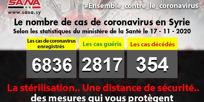 Dans un communiqué, dont une copie est parvenue à SANA, le ministère a fait savoir que le bilan des cas de coronavirus enregistrés jusqu’à présent en Syrie avait atteint 6919, dont 2868 cas de guérison et 358 décès.