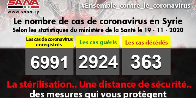 Dans un communiqué dont une copie est parvenue à SANA, le ministère a fait savoir que le bilan des cas de coronavirus enregistrés jusqu’à présent en Syrie avait atteint 6991, dont 2924 cas de guérison et 363 décès.