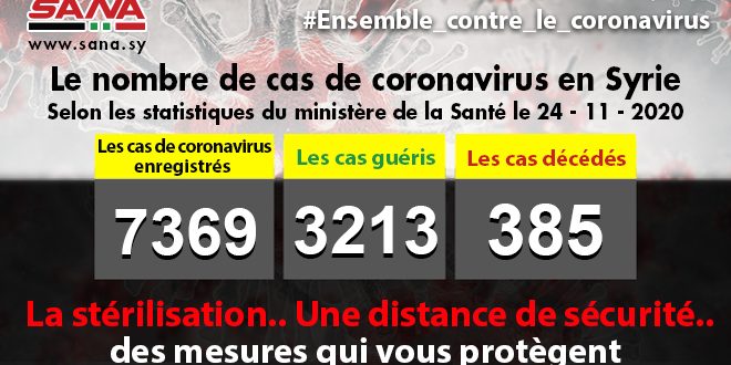 Dans un communiqué dont une copie est parvenue à SANA, le ministère a fait savoir que le bilan des cas de coronavirus enregistrés jusqu’à présent en Syrie avait atteint 7369, dont 3213 cas de guérison et 385 décès.