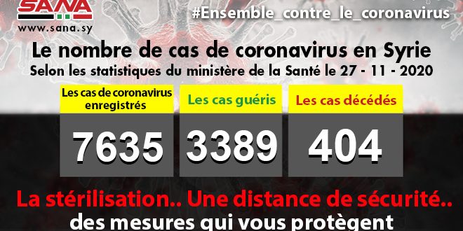 Dans un communiqué dont une copie est parvenue à SANA, le ministère a fait savoir que le bilan des cas de coronavirus enregistrés jusqu’à présent en Syrie avait atteint 7635, dont 3389 cas de guérison et 404 décès.