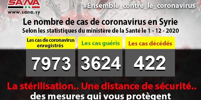 Dans un communiqué dont une copie est parvenue à SANA, le ministère a fait savoir que le bilan des cas de coronavirus enregistrés jusqu’à présent en Syrie avait atteint 7973, dont 3624 cas de guérison et 422 décès.