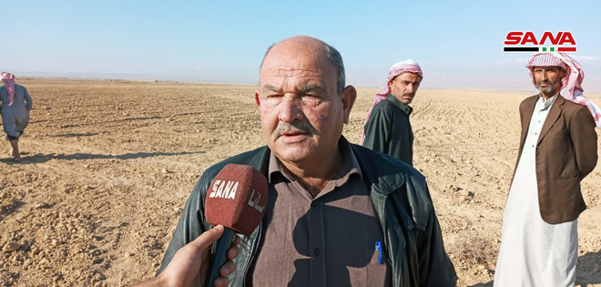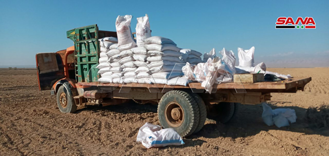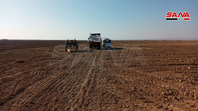 Palmyre-SANA / Les agriculteurs dans la zone de Bayarat Gharbiya dans le désert de Palmyre ont repris la culture dans leurs terres agricoles, dans le cadre de l’exécution du plan agricole hivernal pour l’agriculture du blé et de l’orge, après l’élimination de toutes les mines plantées par les terroristes avant leur expulsion de la zone.