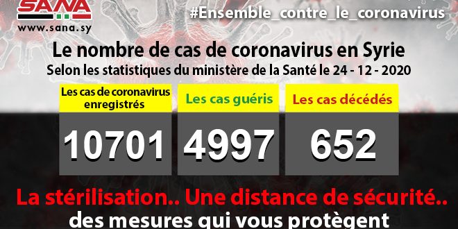 Damas-SANA/Le ministère de la Santé a annoncé que la Syrie avait enregistré, le 24 décembre, 130 nouveaux cas de coronavirus, 70 cas de guérison et 11 décès parmi les cas auparavant enregistrés.