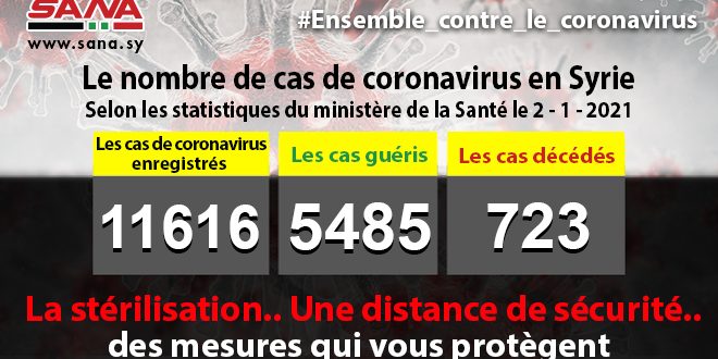 Dans un communiqué, dont une copie est parvenue à SANA, le ministère a indiqué que le bilan des cas de coronavirus enregistrés jusqu’à présent en Syrie avait atteint 11616, dont 5485 cas de guérison et 723 décès.
