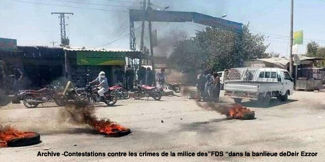 Citées par le correspondant de SANA, des sources locales ont indiqué que les habitants du village d’Abo Hamam, dans la banlieue est de Deir Ezzor, avaient manifesté sur la place de Qahawa pour dénoncer les pratiques de la milice des « FDS », qui enlève des jeunes hommes pour les obliger à combattre dans ses rangs.