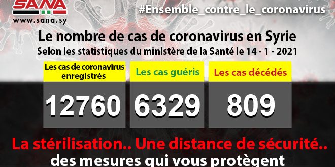 Dans un communiqué, dont une copie est parvenue à SANA, le ministère a indiqué que le bilan des cas de coronavirus enregistrés jusqu’à présent en Syrie avait atteint 12760, dont 6329 cas de guérison et 809 décès.